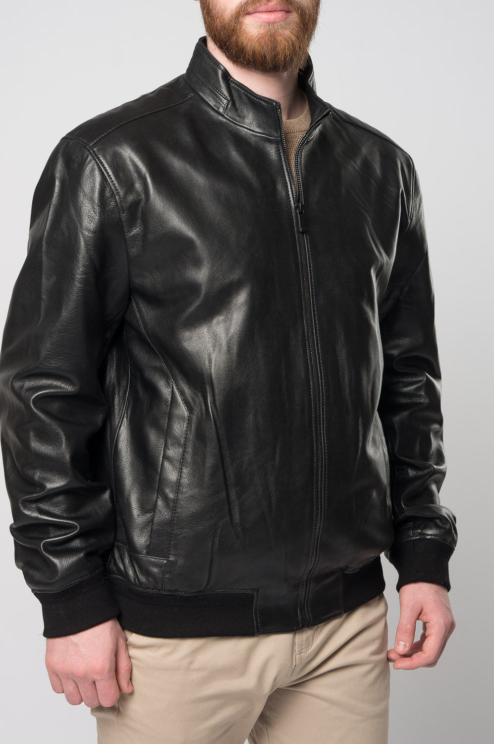 Классическая мужская куртка-бомбер на молнии в черном цвете. Это изделие выполнено из приятной на ощупь, прочной и износостойкой натуральной кожи. Фасон бомбер позволяет куртке надежно фиксироваться на теле за счет резинок по низу изделия и на рукавах. Модель дополнена невысоким воротником-стойкой и кнопками. Отлично сочетается с брюками, джинсами, ботинками и кроссовками. Подходит для городской жизни.