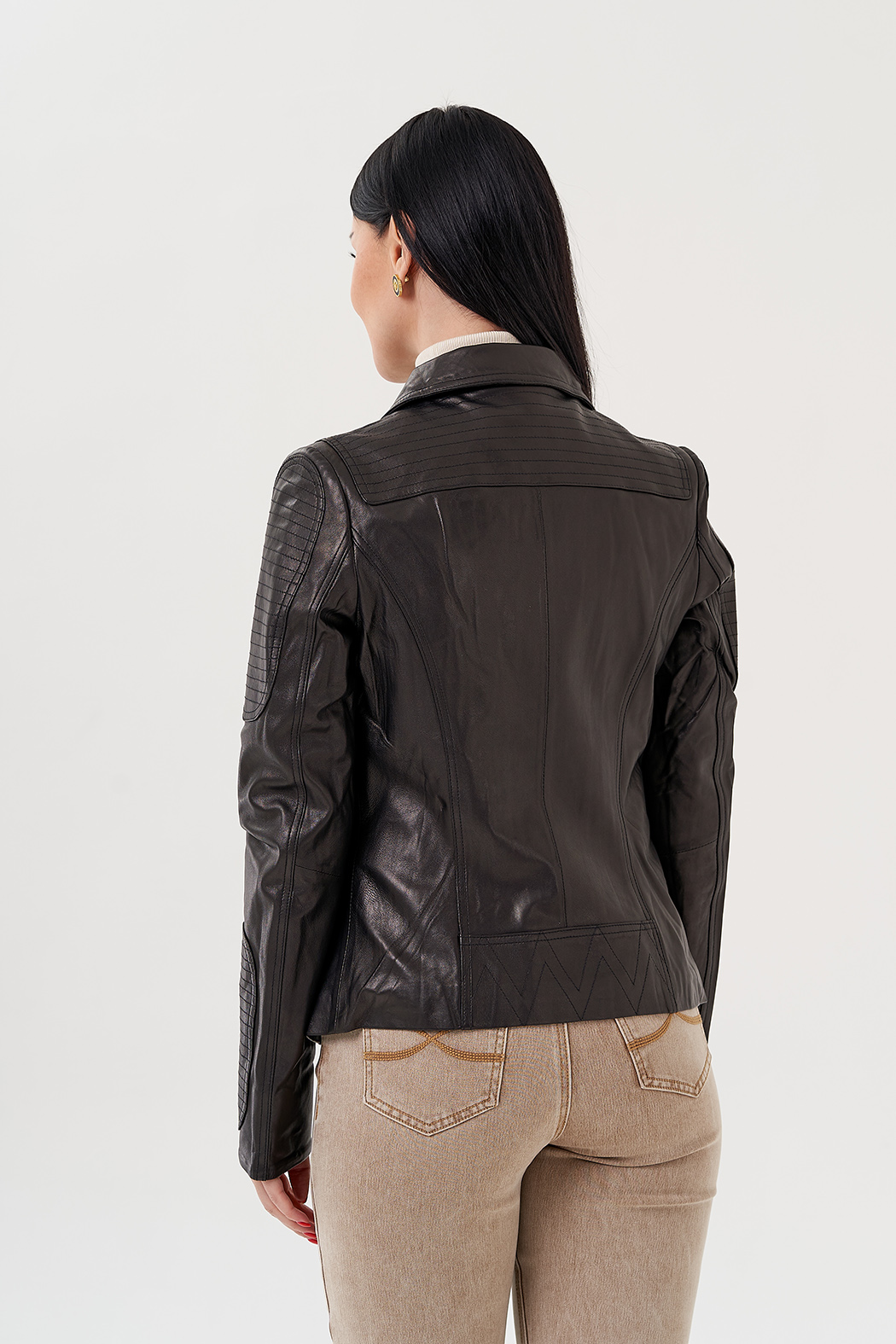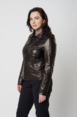 Куртка из натуральной кожи - изящная и универсальная вещь в гардеробе. Выполнена в черном цвете, что делает ее практичной. Модель приталенная, что делает ее более женственной. Застегивается на молнию. Воротник можно поднять и закрепить на ремешки. По бокам есть карманы на молнии. Куртка стилизована накладными вставкамина рукавах и плечах.